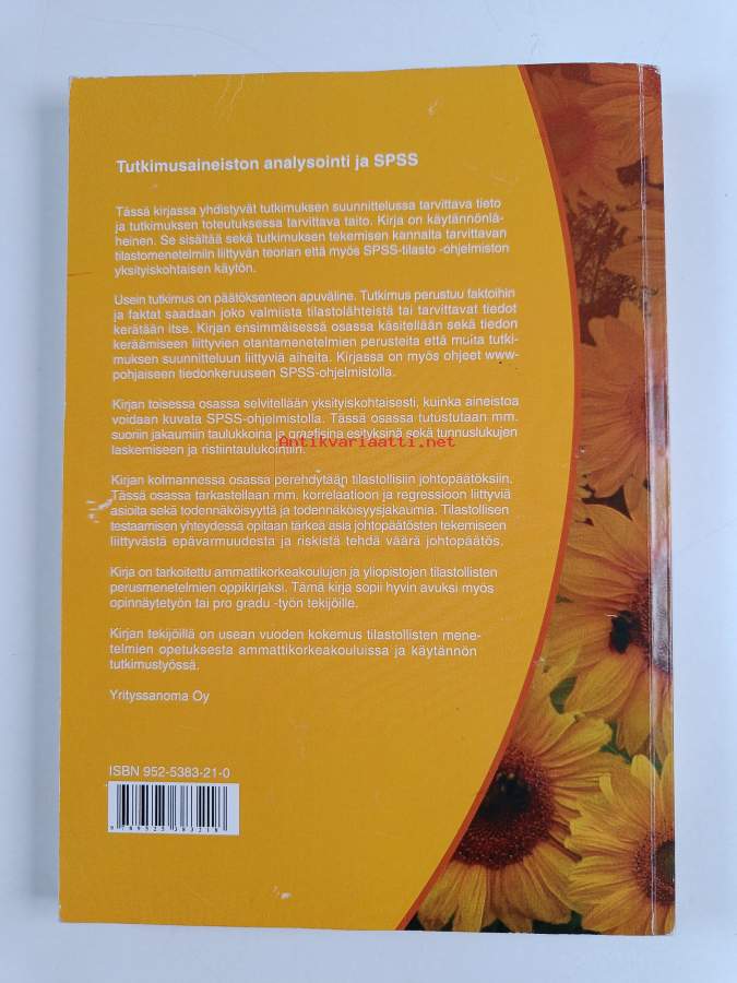 Muu(t) tekijä(t): Pertti Vuorinen, Lauri TenhunenSarja: TradenomiaAsiasanat: tutkimus, tilastotiede, tiede, tilastot, tutkimusmenetelmät, tutkimusaineisto, graafinen esitys, tunnusluvut, tilastomenetelmät, tietokoneohjelmat, analyysimenetelmät, otanta, SPSS
