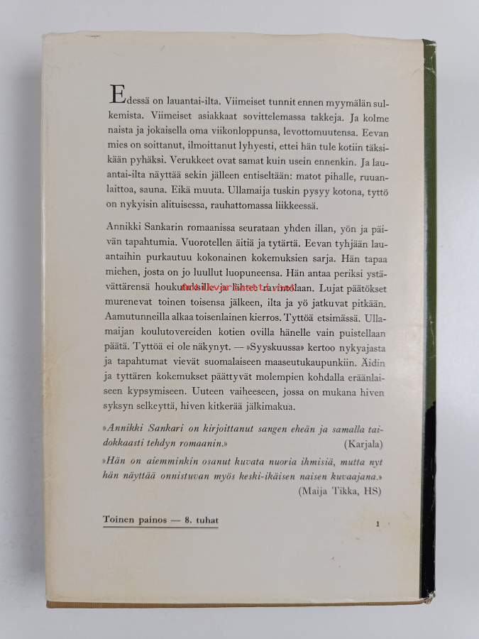 Hyvä. Tarkempi kuntoluokka: K3- ; Hieman kulumaa kansissa, tyhjä etulehti irrotettu, selkämyksessä hieman vinoutta, sidos hieman näkyvissä yhdellä aukeamalla. Kansipaperin kunto: jonkin verran kulumaa/pienoisia repeämiä