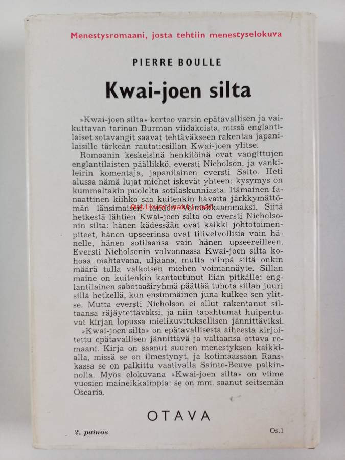 Kwai joen silta / Pierre Boulle. Kova kantinen, ilman kansipaperia Suomalainen kirjakauppa P.1969