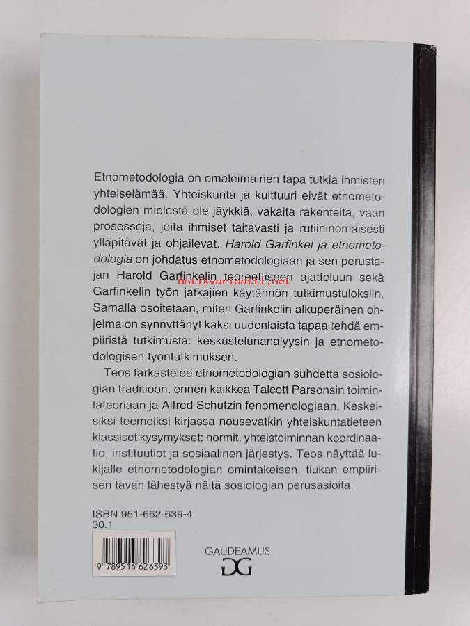 Muu(t) tekijä(t): Anssi Peräkylä, Sanna Vehviläinen ym.Alkuteos: Garfinkel and ethnomethodologyAsiasanat: teoriat, fenomenologia, normit, tutkimusmenetelmät, sosiologia, diskurssianalyysi, toimintateoria, instituutiot, communication, Sociology, keskustelunanalyysi, etnometodologia