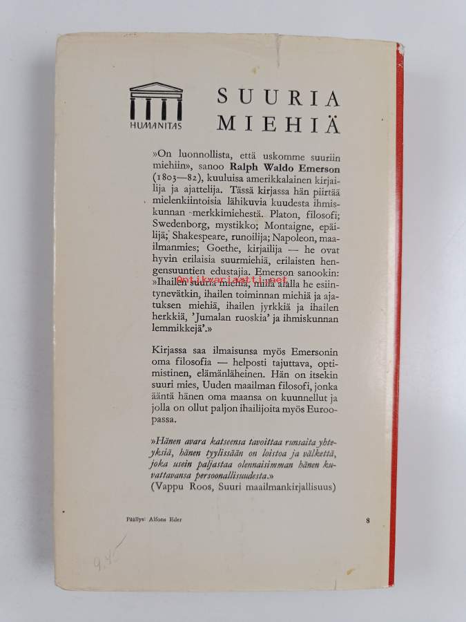Muu(t) tekijä(t): J. A. HolloSarja: Humanitas 18Alkuteos: Representative menAsiasanat: Platon, napoleon, Shakespeare, GOETHE, Swedenborg, Montaigne