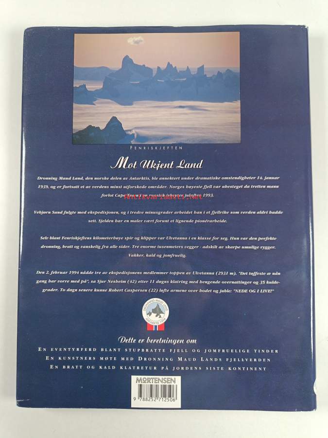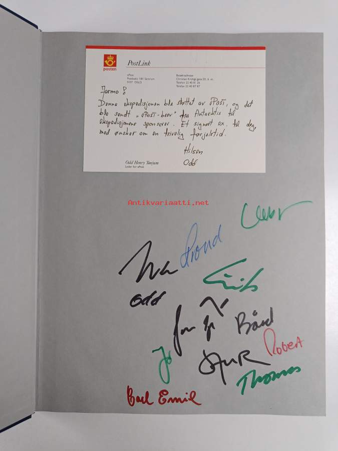 Kansipaperin kunto: jonkin verran kulumaa/pienoisia repeämiä / etulehdelle liimattu postikortti jossa on tervehdys kirjan alkuperäiselle saajalle, kirjassa useita signeerauksia etunimillä, mukana oletettavasti Ivar Erik Tollefsenin johtaman retkikunnan jäseniä, mukana myös Tollefsenin oma nimikirjoitus