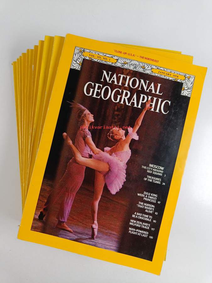 Hyvä. Pienoista repeämää selkämyksessä, pienoista kulumaa reunoilla, selkämyksessä hieman vinoutta. National Geographic -lehden vuosikerta 1978 numerot 1-6, 8-12 yksittäisnumeroina, heinäkuun numero puuttuu