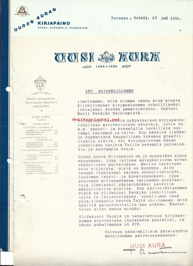 Uusi Aura Turku 1931- firmalomake 2 eril