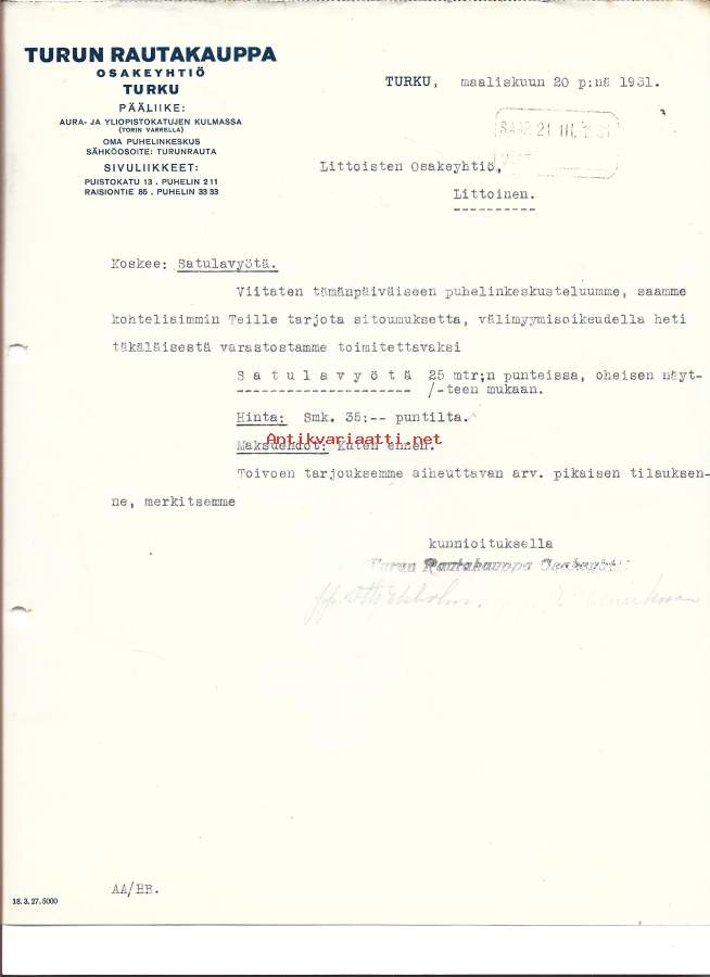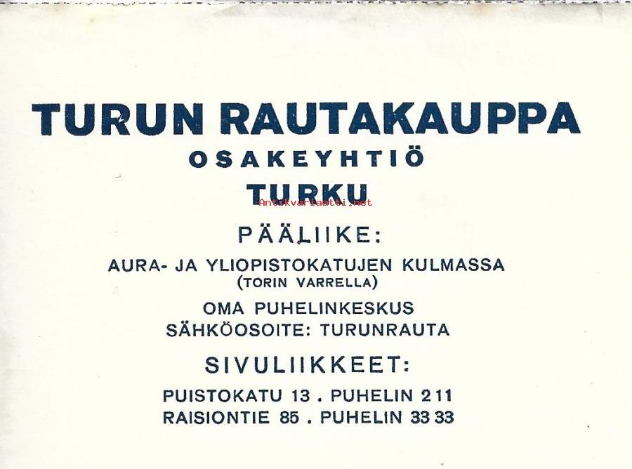 Turun Rautakauppa Oy Turku 1931- firmalomake