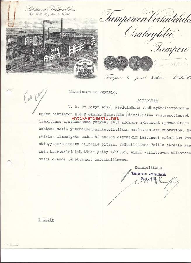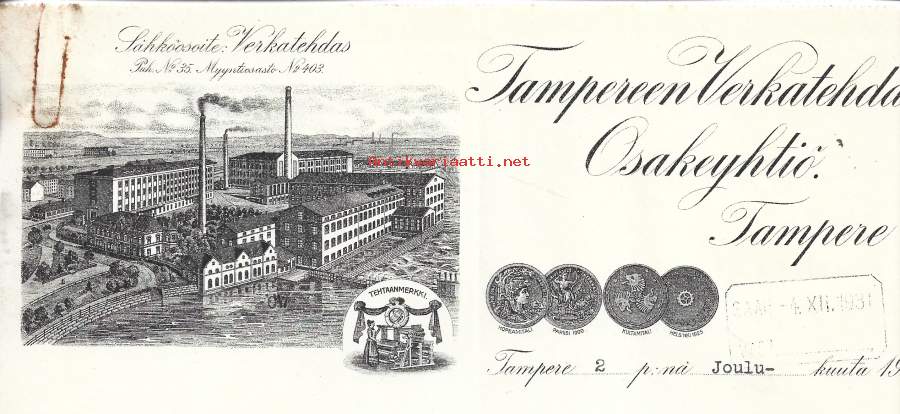 Tampereen Verkatehdas Oy Tampere 1931- firmalomake