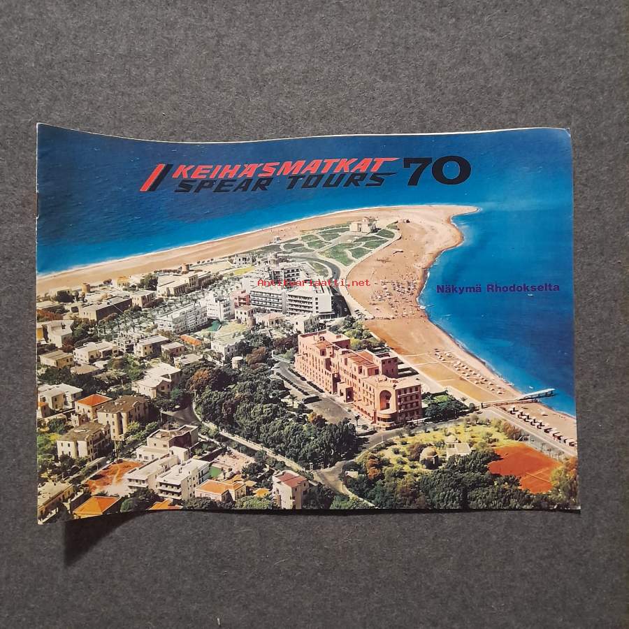 Matkatoimistoon tarkoitettu Keihäsmatkojen ikkuna tarra. "täällä myydään Keihäsmatkoja edullisia seuramatkoja etelän aurinkoon" Etupuolelta liimautuva ikkuna tarra.