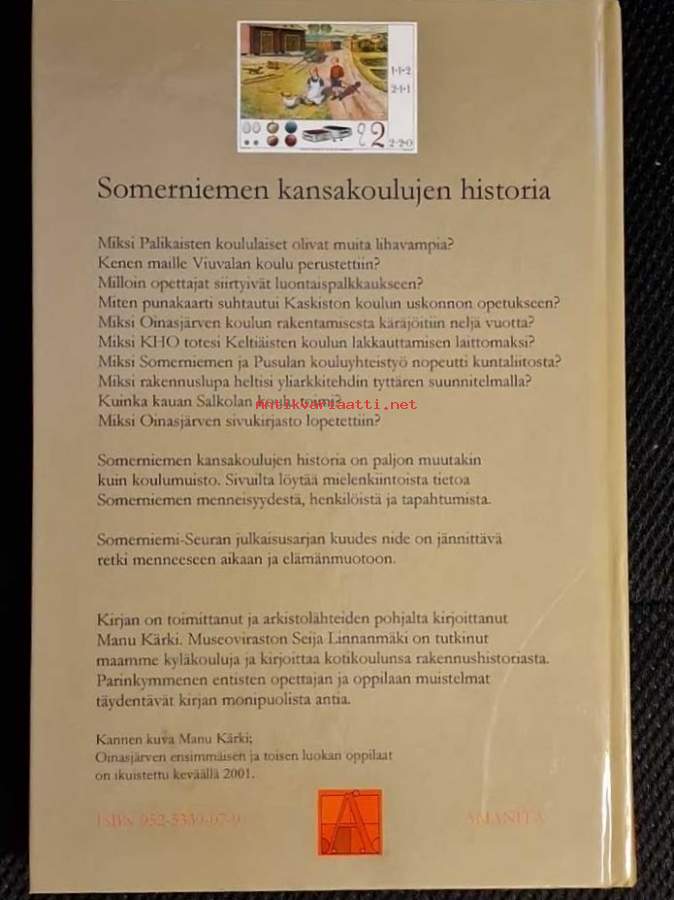 Ulkoasu 328 sivua : kuvitettu ; 26 cmKieli suomiJulkaisija Somero : Amanita, 2001Sarja Somerniemi-seuran julkaisuja, ISSN 0786-2164; n:o 6.Somerniemi-seuran julkaisuja, ISSN 0786-2164; n:o 6Luokitus Peruskoulu. Lukio (udkf 373)Aiheet kansakoulu koululaitos historia kouluhistoriikit Somerniemi Valmistaja (Hämeenlinna : Karisto)Lisätiedot kirjoittanut ja toimittanut Manu Kärki ; [julkaisija: Somerniemi-seura ry]ISBN 952-5330-07-9 sidottu