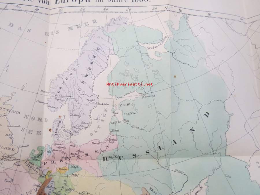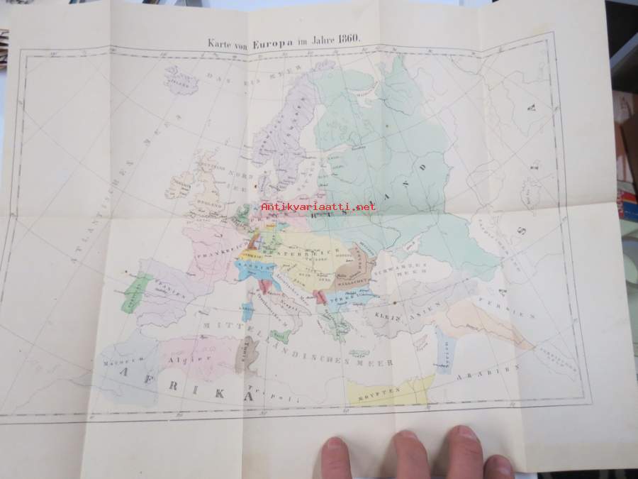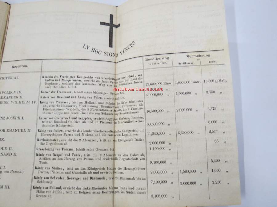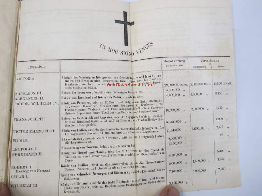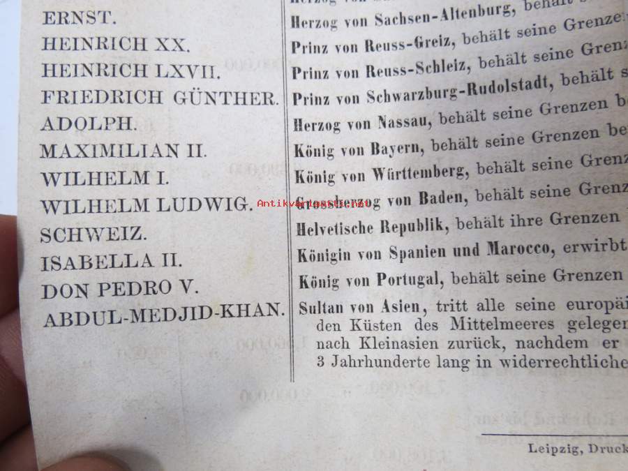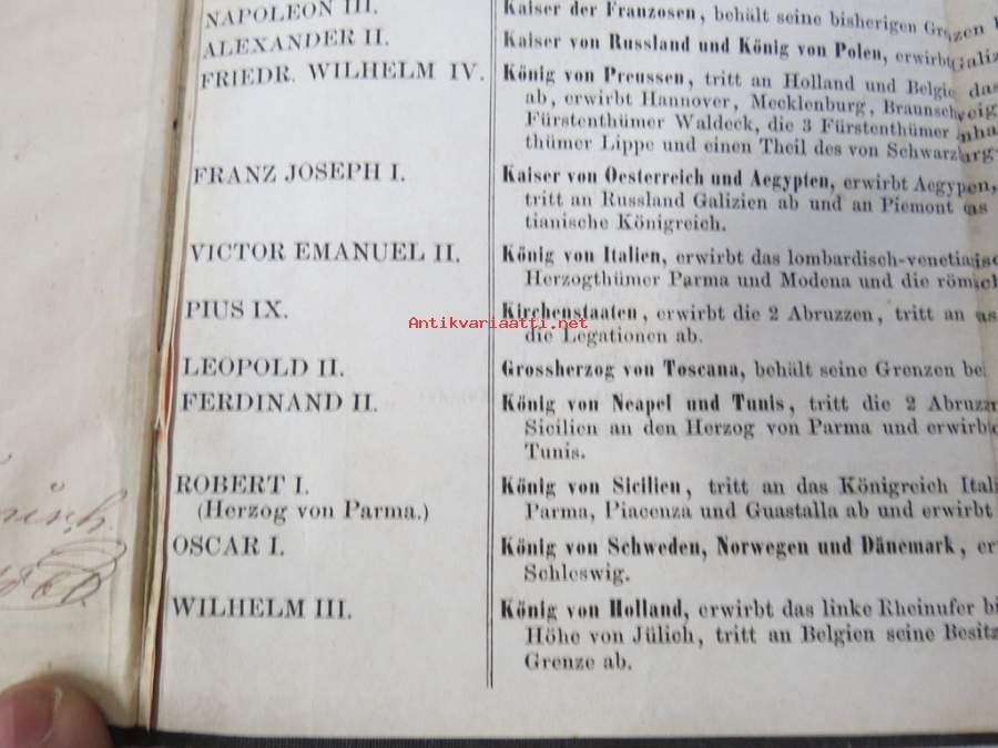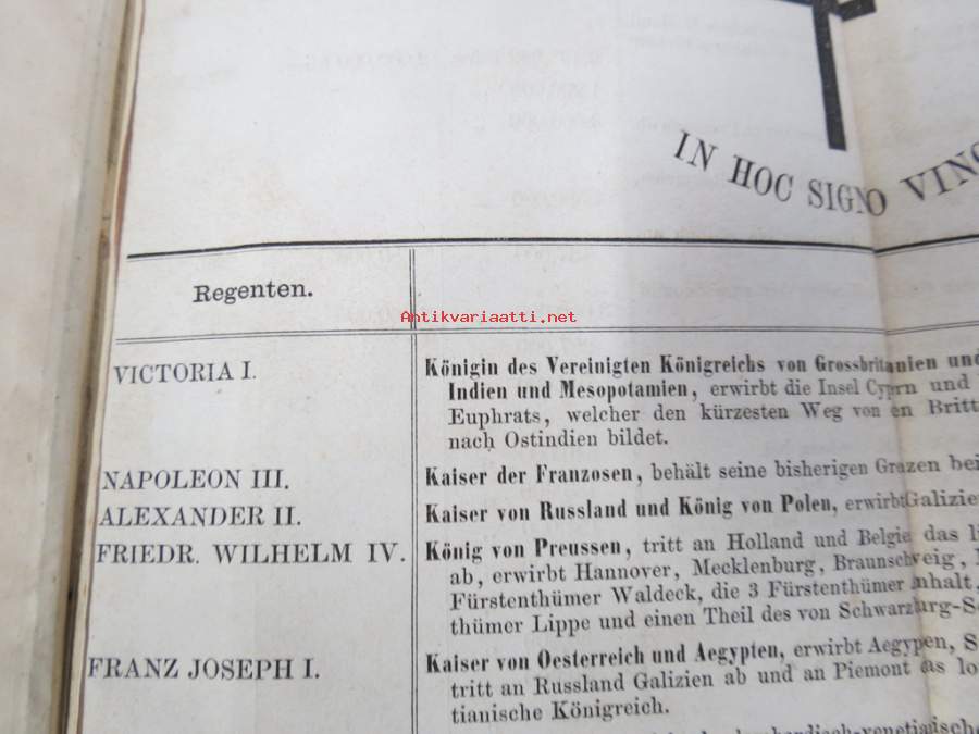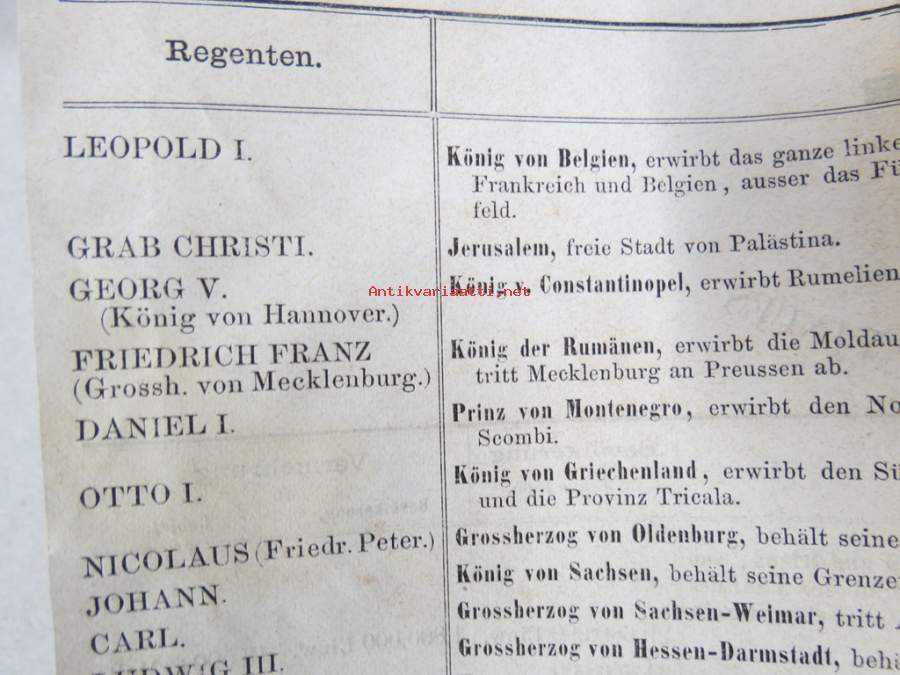 Karte von Europa im Jahre 1860 -Euroopan kartta, mukana tuolloisten "regenttien" eli hallitsijoiden luettelo