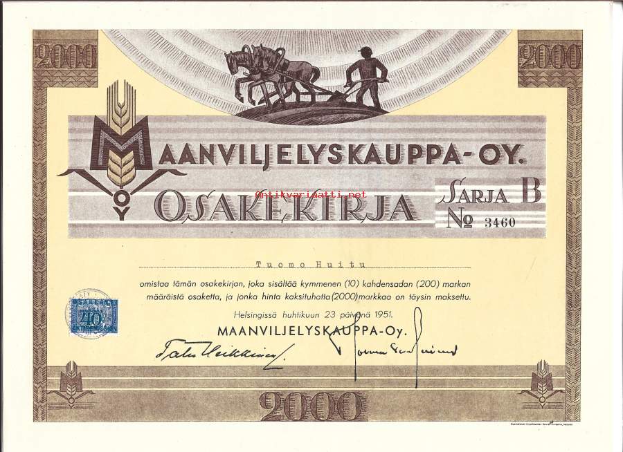 Maanviljelyskauppa Oy 2 000 mk Helsinki 1951 - osakekirja,