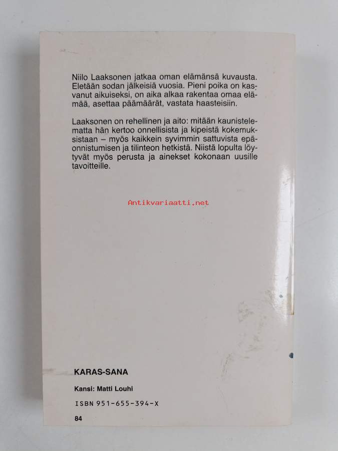 Tyydyttävä. Tarkempi kuntoluokka: K2- ; Hieman kulumaa kansissa, läikkää, pienoista kolhua kansissa, pienoista tahraisuutta kansissa, edessä vanhoja hintalappuja. hieman läikkää sivuilla sekä aaltoilua