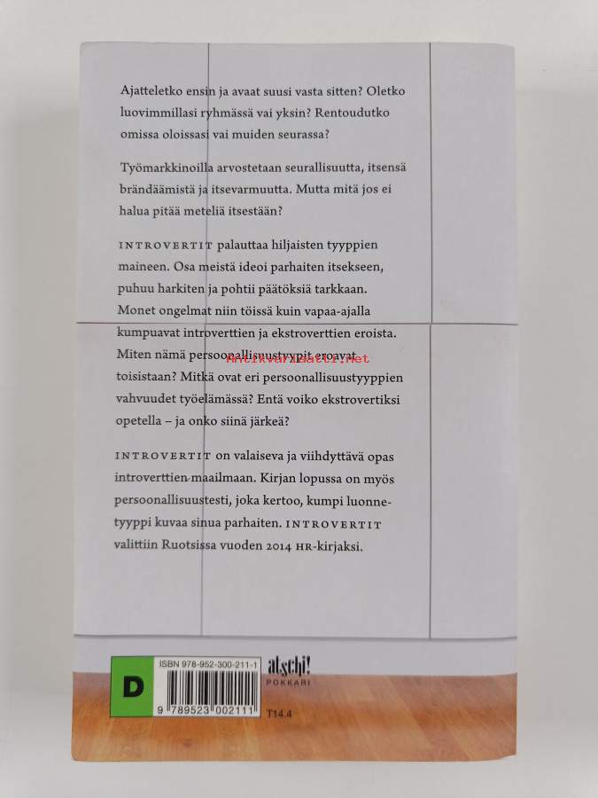 Muu(t) tekijä(t): Ulla (suom.) LempinenSarja: Atschi!-pokkariAlkuteos: IntrovertAsiasanat: työelämä, persoonallisuuden piirteet, temperamentti, introversio