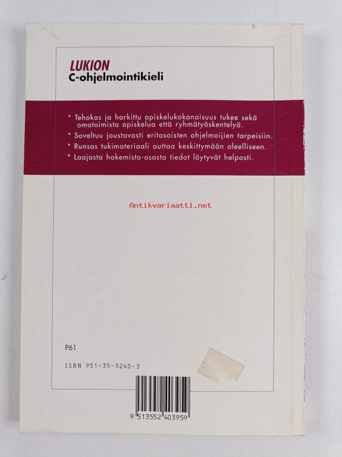 Hyvä. Tarkempi kuntoluokka: K3- ; Pientä kulumaa, pienoista repeämää takakannen yläreunassa, takana hintalapun jäämää