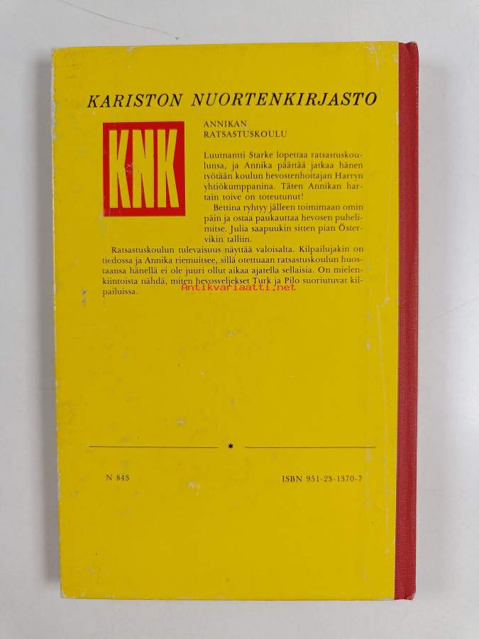 Muu(t) tekijä(t): A.-M. HelminenMerkinnät: omistajamerkintäSarja: Kariston nuortenkirjasto ; AnnikaAlkuteos: Annikas ridskola