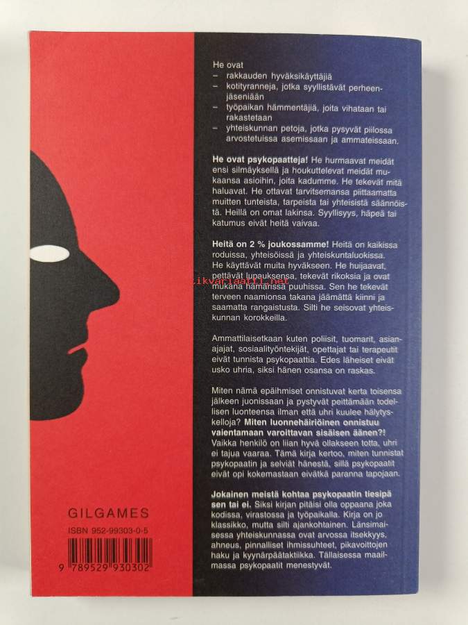 Muu(t) tekijä(t): Veijo (suom.) Kiuru, Pirjo (suom.) HaapojaAlkuteos: Without conscience : the disturbing world of the psychopaths among usAsiasanat: psykopaatit, sosiopatia