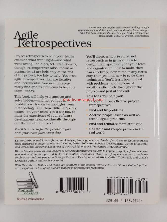 Muu(t) tekijä(t): Diana LarsenSarja: The pragmatic programmersAsiasanat: henkilöstöjohtaminen, projektit, tiimityö, projektinhallinta, projektijohtaminen, tiimit, osaamisen johtaminen