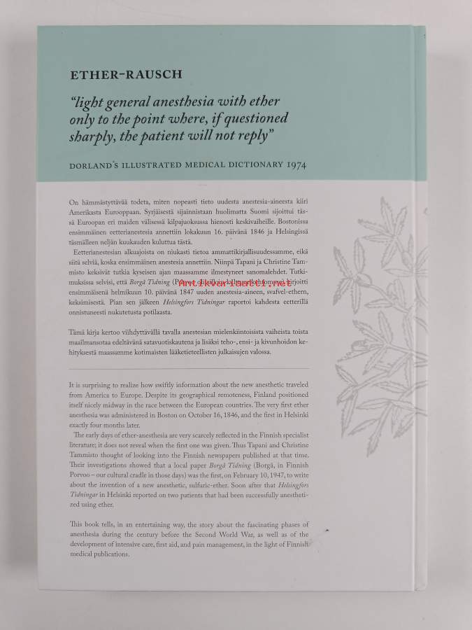 Koko nimi: Ether-Rausch : eetteristä erikoisalaksi : anestesian, teho-, ensi ja kivunhoidon kehitys kotimaisen kirjallisuuden valossa vuodesta 1847 alkaen = from ether to medical speciality : development of anesthesia, intensive care, first aid and pain management iMuu(t) tekijä(t): Christine Tammisto, Virve MäkeläMerkinnät: omistajamerkintäAsiasanat: oppihistoria, elvytys, ensihoito, nukutus, anestesiologia, puudutus, kivunhoito, tehohoito, Anesthesiology, History, 20th Century, Resuscitation, Intensive Care, Pain Clinics, nukutusaineet