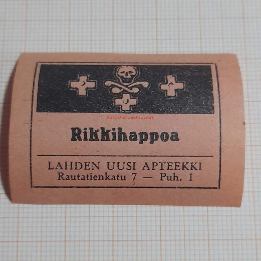 Lahden uusi apteekki Rikkihappoa etiketti / tarra