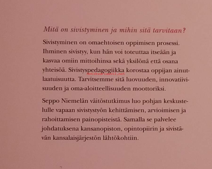 Sivistyminen on omaehtoisen oppimisen prosessi. Ihminen sivistyy, kun hän voi toteuttaa itseään ja kasvaa omiin mittoihinsa sekä yksilönä että osana yhteisöä. Sivistyspedagogiikka korostaa oppijan ainutlaatuisuutta. Tarvitsemme sitä luovuuden, innovatiivisuuden ja oman aloitteellisuuden moottoriksi. Dimensiot 21 ¤ 15 cm.