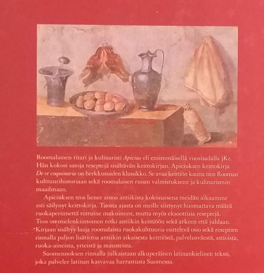 Roomalainen ritari ja kulinaristi Apicius eli ajanlaskumme ensimmäisellä vuosisadalla ja kokosi tuolloin satoja reseptejä sisältävän keittokirjan. Apiciuksen keittokirja De re coqvinaria on herkkusuiden klassikko. Kokkikirja avaa keittiön kautta tien Rooman kulttuurihistoriaan ja roomalaisen ruoan valmistuksen ja herkuttelun maailmaan.