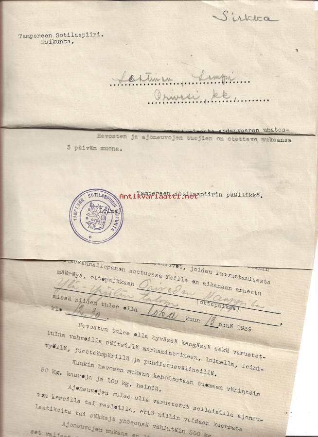 Puolustusministeriö käskee... sodanvaaran uhatessa..luovuttaa ...hevoset ja kesäajoneuvot,,, lokakuun 13 p 1939 Orivesi