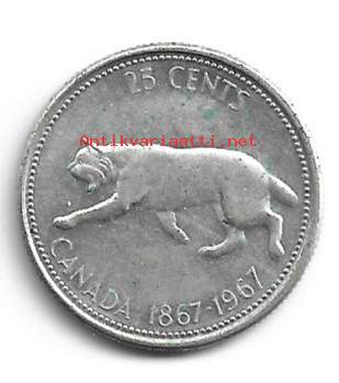 Liikkeellelaskija Kanada Kuningatar Elisabet II (1952-2022)Tyyppi Liikkeessä olevat juhlarahatVuosi 1967Arvo 25 senttiä0,25 CAD = 0,15 euroaValuutta Dollari (1858-päivä)Sävellys Hopea (.800) (.800 hopea .200 kupari)Paino 5,83 grammaaHalkaisija 23,88 mmPaksuus 1,76 mmMuoto PyöreäTekniikka JauhettuSuunnistus Mitalin kohdistus ↑↑Numero N#367ApuaViittaukset KM# 68, Schön# 70