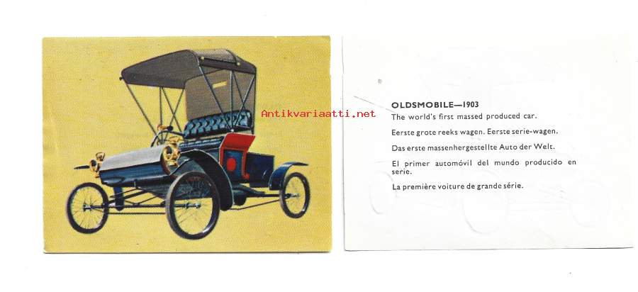 Oldsmobile 1903 - kohopaino kiiltokuva, keräilykuva 6x8 cm tekniset tiedot takana