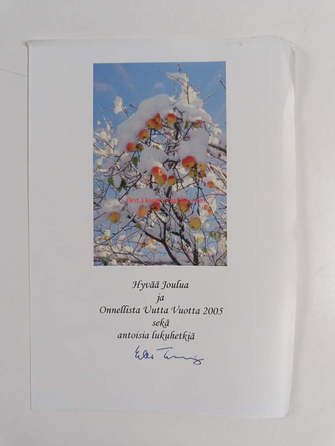 Erinomainen. Tarkempi kuntoluokka: K4- ; Pienoista kulumaa kansissa. Mukana tekijän signeeraama joulukortti