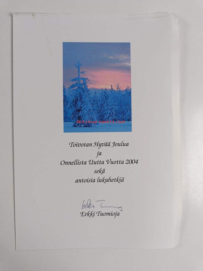 Erinomainen. Tarkempi kuntoluokka: K4- ; Pienoista kulumaa kansissa. Mukana tekijän signeeraama joulukortti