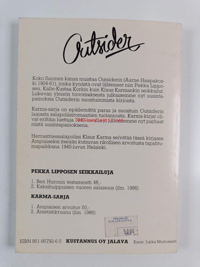 Hyvä. Tarkempi kuntoluokka: K3+ ; Hieman kulumaa kansissa, selkämyksessä hieman vinoutta, takana vanha hintalappu