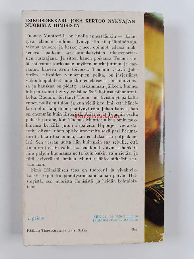 Hyvä. Tarkempi kuntoluokka: K3- ; Pientä nuhruisuutta, pienoista repeämää selkämyksessä, pienoista taitejälkeä, selkämyksessä hieman vinoutta, selkämyksessä lukutaittumaa. Kansipaperin kunto: jonkin verran kulumaa/pienoisia repeämiä