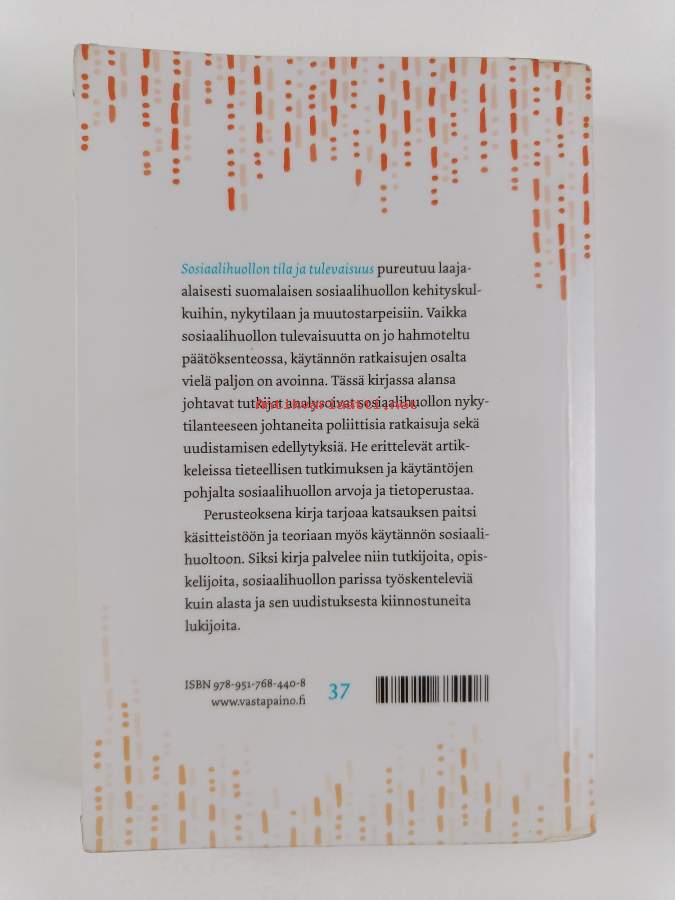 Muu(t) tekijä(t): Tarja Pösö, Riitta Haverinen ym.Asiasanat: historia, tutkimus, lainsäädäntö, muutos, terminologia, tulevaisuus, arvot, sosiaalityö, yhdyskuntatyö, sosiaaliturva, sosiaalipolitiikka, käsitteet, sosiaalihuolto, kehitys, sosiaalipalvelut, sosiaaliala, asiakastyö, sosiaalityöntekijät, hyvinvointipolitiikka, työpaikkaväkivalta, aikuissosiaalityö, pakolaistyö, näyttöön perustuvat käytännöt