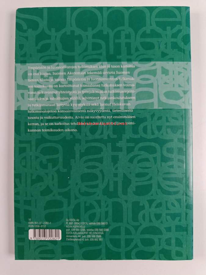 Sarja: Suomen akatemian julkaisuja 12/97Asiasanat: tutkimuslaitokset, tutkimus, luonnonvarat, yliopistot, korkeakoulut, tutkimushenkilöstö, tutkijakoulutus, tutkimusrahoitus, ympäristötieteet