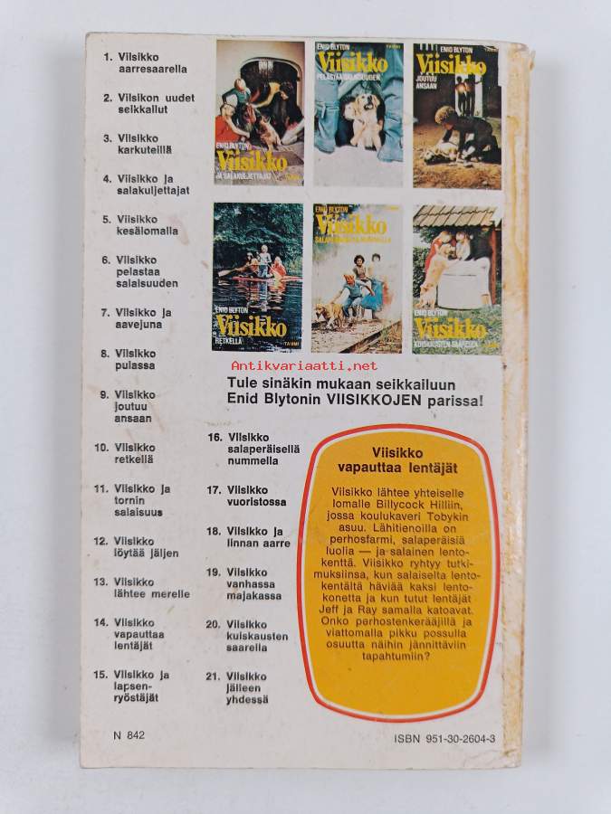 Muu(t) tekijä(t): Lea KarvonenMerkinnät: omistajamerkintä leikattu pois etulehden ylälaidastaSarja: Viisikko-sarja 14Alkuteos: Five go to Billycock Hill