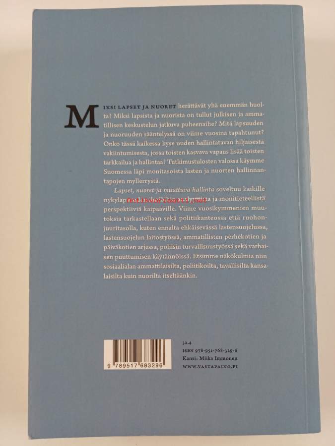 Muu(t) tekijä(t): Leena Alanen, Mirja Satka ym.Asiasanat: nuoret, hyvinvointivaltio, lapsuus, lapset, muutos, lastensuojelu, hyvinvointi, hallinta, sosiaalityö, kasvatus, nuoruus, julkinen keskustelu, rajat, perhepolitiikka, pedofilia, lapsiperheet, kasvatustavoitteet, varhainen puuttuminen, säännöt, seksuaalirikokset, lapsipolitiikka, nuorisopolitiikka, kontrolli