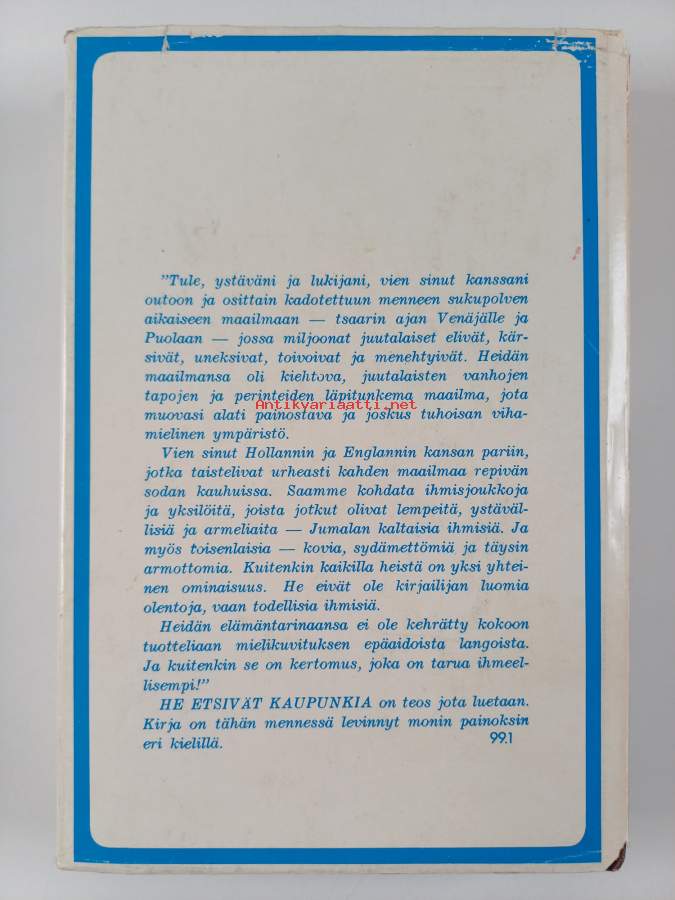 Hyvä. Tarkempi kuntoluokka: K3- ; Hieman kulumaa kansissa, pienoista nuhruisuutta kansissa, pienoista kolhua selkämyksen päissä, tyhjä etulehti irrotettu, selkämyksessä hieman vinoutta. Kansipaperin kunto: joitain repeämiä/kulumaa