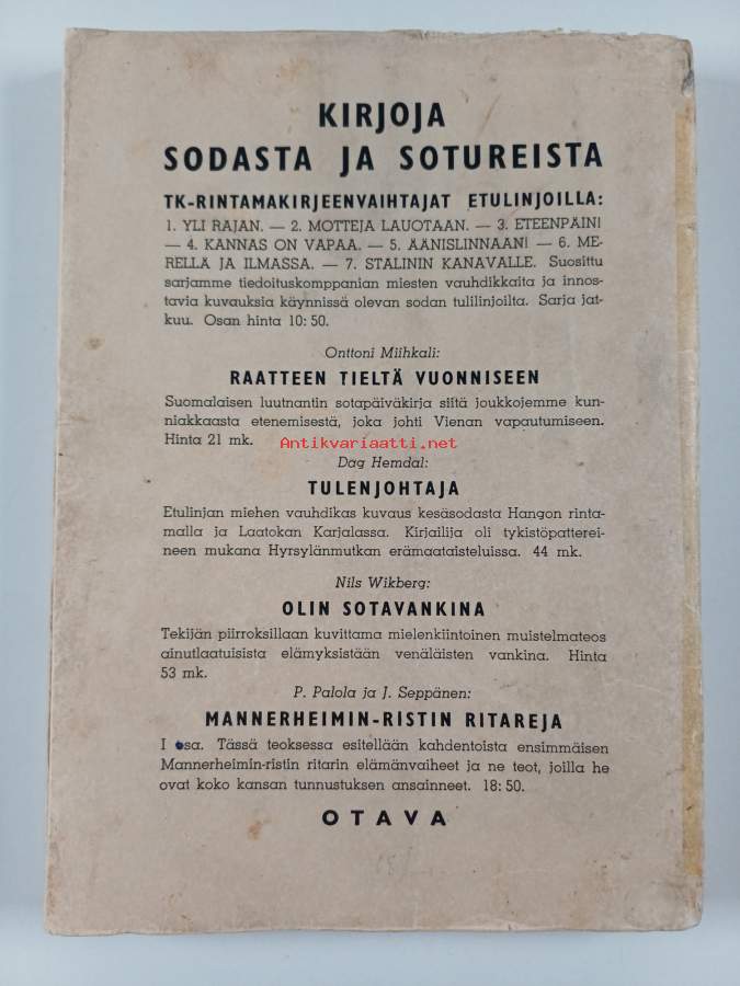 Tyydyttävä. Pientä tahraisuutta, pientä kulumaa, hieman repeämää selkämyksen alareunassa, kansien reunoilla taittumaa ja rispaantumaa (koska ohuehkot kannet sivuja leveämmät). selkämyksessä liimaa