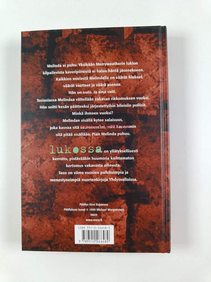 Muu(t) tekijä(t): Arja KanteleMerkinnät: omistajamerkintäAlkuteos: SpeakAsiasanat: ahdistus, nuortenkirjallisuus, yksinäisyys, tyttökirjat, raiskaus, lukiot, koululaislukiot