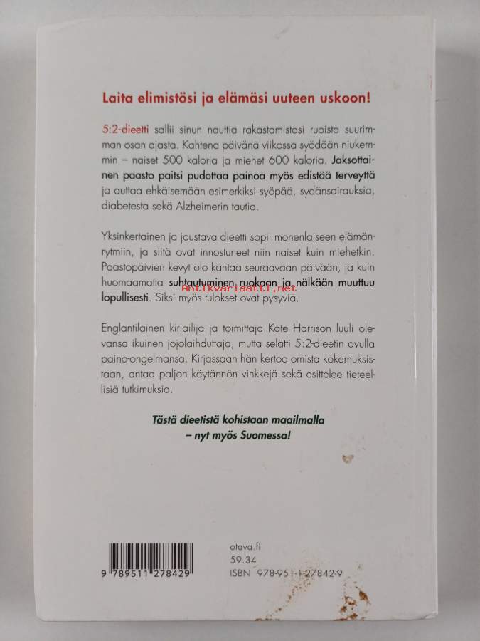 Muu(t) tekijä(t): Elina LustigAlkuteos: The 5:2 diet bookAsiasanat: päiväkirjat, laihdutus, paasto, 5:2-dieetti