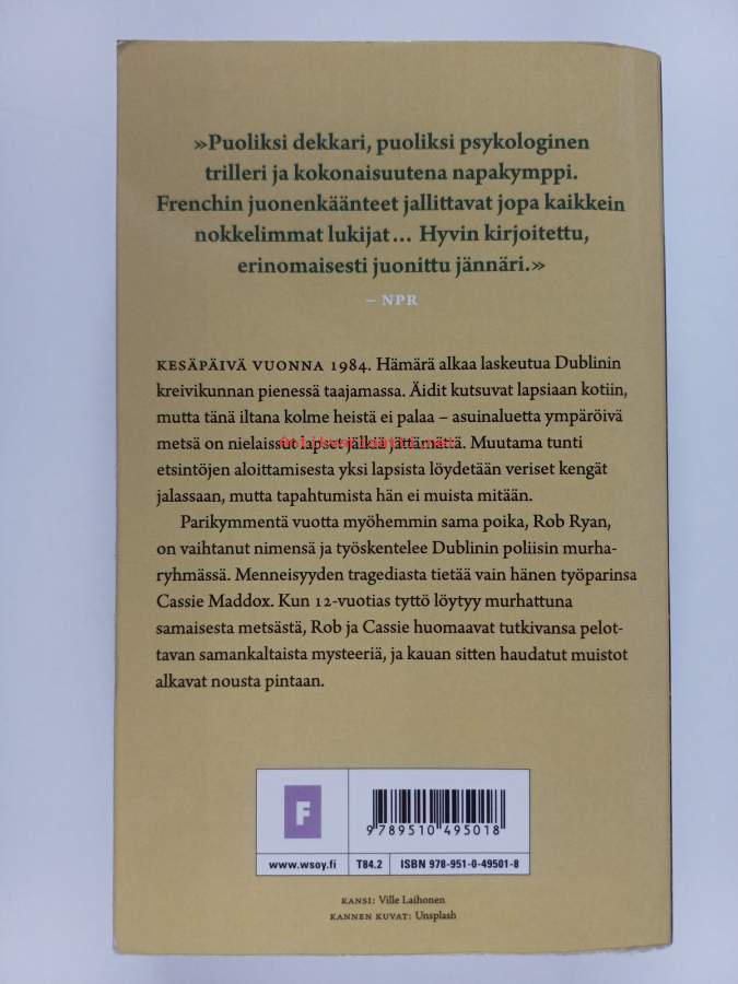 Muu(t) tekijä(t): Natasha VilokkinenSarja: Dublinin murhat [1Alkuteos: In the woodsAsiasanat: murha, lapsuus, metsät, sarjamurhaajat, pahoinpitely, selvittämättömät rikokset, poliisitutkinta, katoaminen, poliisit, lapset (ikäryhmät), löydöt, muistinmenetys, uusi henkilöllisyys, toisto