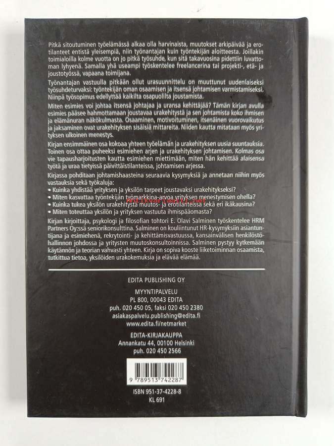 Merkinnät: omistajamerkintäSarja: YritysjulkaisutAsiasanat: työterveys, johtaminen, työelämä, työyhteisöt, muutos, ammatillinen kehitys, työläiset, palkitseminen, urakehitys, esimiehet, henkilöstöjohtaminen, henkilöstöhallinto, oppiminen, organisaatiot, työhyvinvointi, työpsykologia, henkilöstö, työntekijät, irtisanominen, urasuunnittelu, asiantuntijuus, sitoutuminen, tukeminen, motivointi, työura, henkinen pääoma, joustavuus, erottaminen, esihenkilöt, sitoutuminen (toiminta)