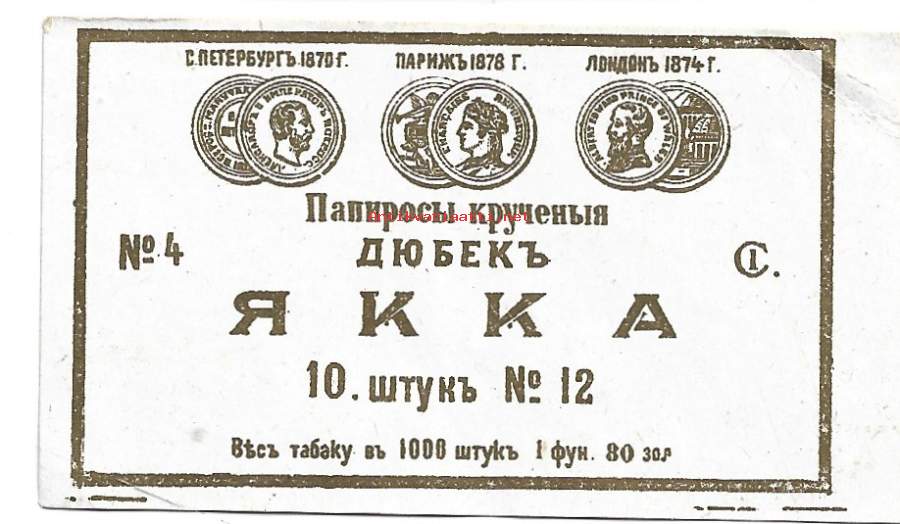 S. PETERSBURG 1870AMNEPARIISI 1878LONTOON 1874PRINERin osasto№4Kierretyt savukkeet DUBEK