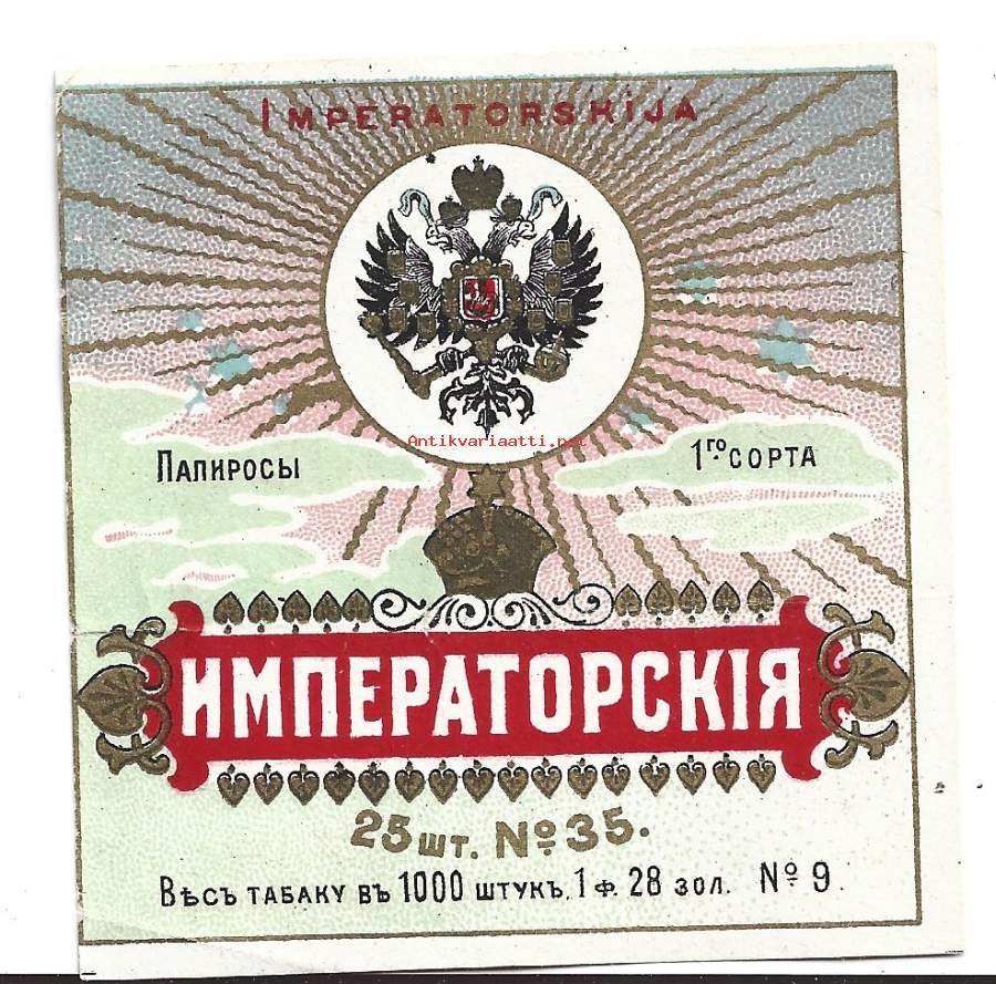 Savukkeen etiketti. Savukkeet "keisarillinen". 25 kpl Nro 35.Kromolitografi kullalla. - tupakkaetiketti