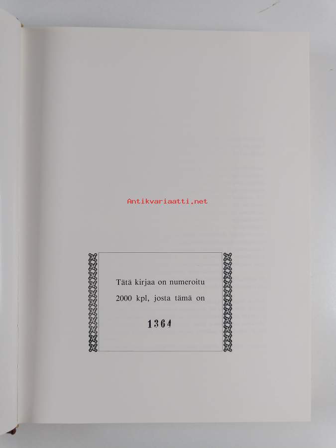 Hyvä. Tarkempi kuntoluokka: K3+ ; Pienoista kolhua selkämyksen päissä, pienoista tahraisuutta kansissa. Kansipaperin kunto: joitain repeämiä/kulumaa / numeroitu (1364/2000)