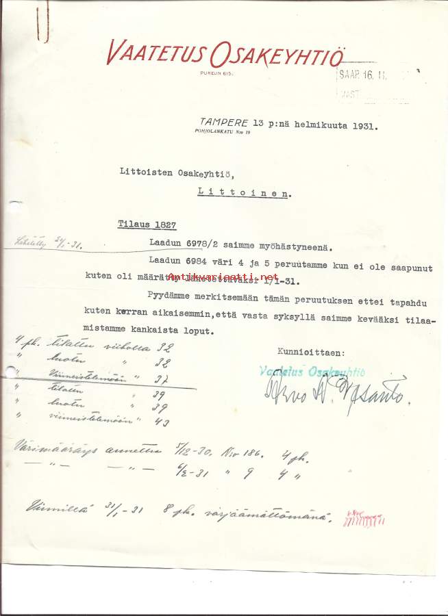 H. T. Timonen Vaatetus ja Kangaskauppa Iisalmi 6.9.1937 -asiakirja