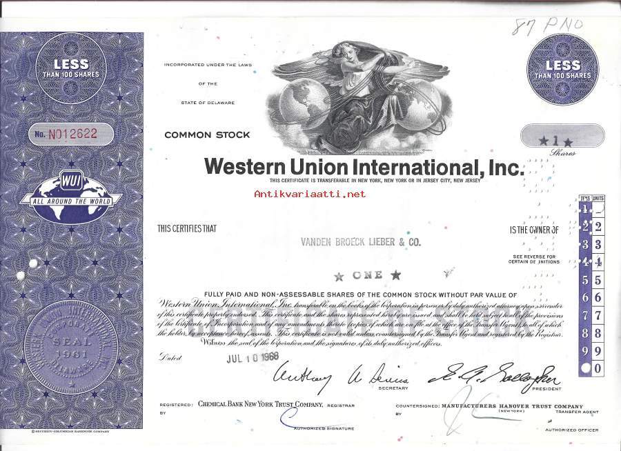 Western Union International Inc 1968USA- osakekirja