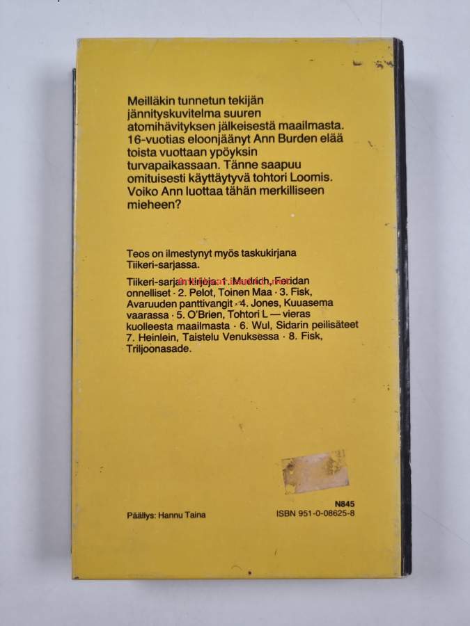 Tyydyttävä. Tarkempi kuntoluokka: K2+ ; Hieman kulumaa kansissa, pienoista repeämää selkämyksen alakulmissa, tyhjä etulehti irrotettu, selkämyksessä vinoutta, takana hintalapun jäämää