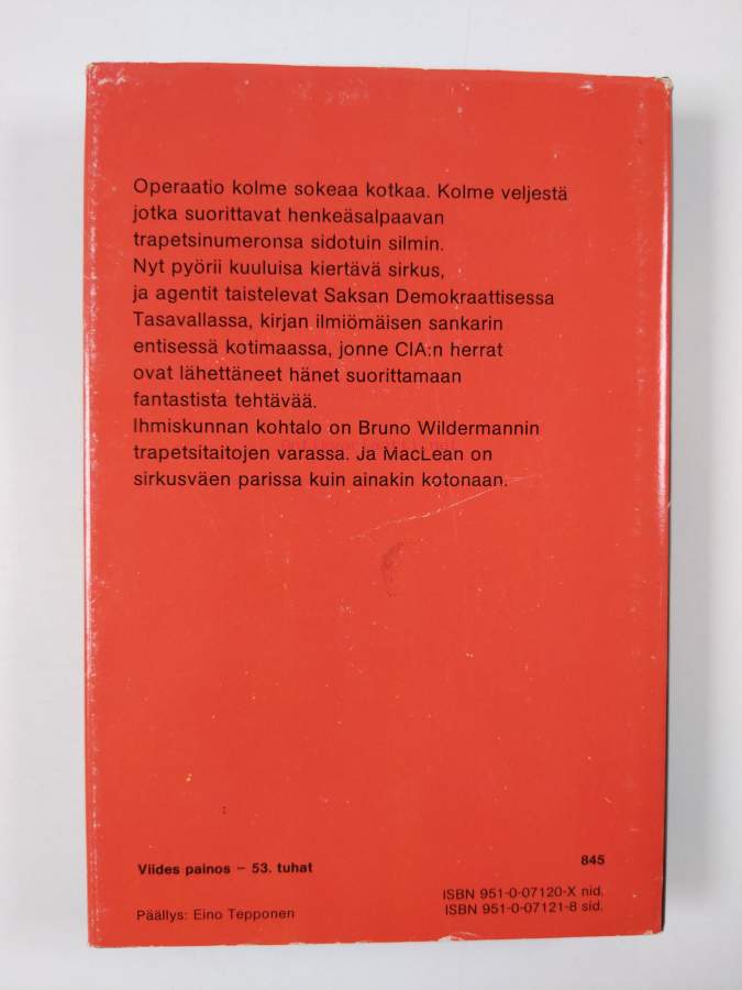 Kuolonhyppy, 1975. 5. painos.MacLeanin uuden jännitysromaanin tapahtumat sijoittuvat kiertävään sirkukseen ja jännityksen maailmanmestari liikkuu sirkusväen