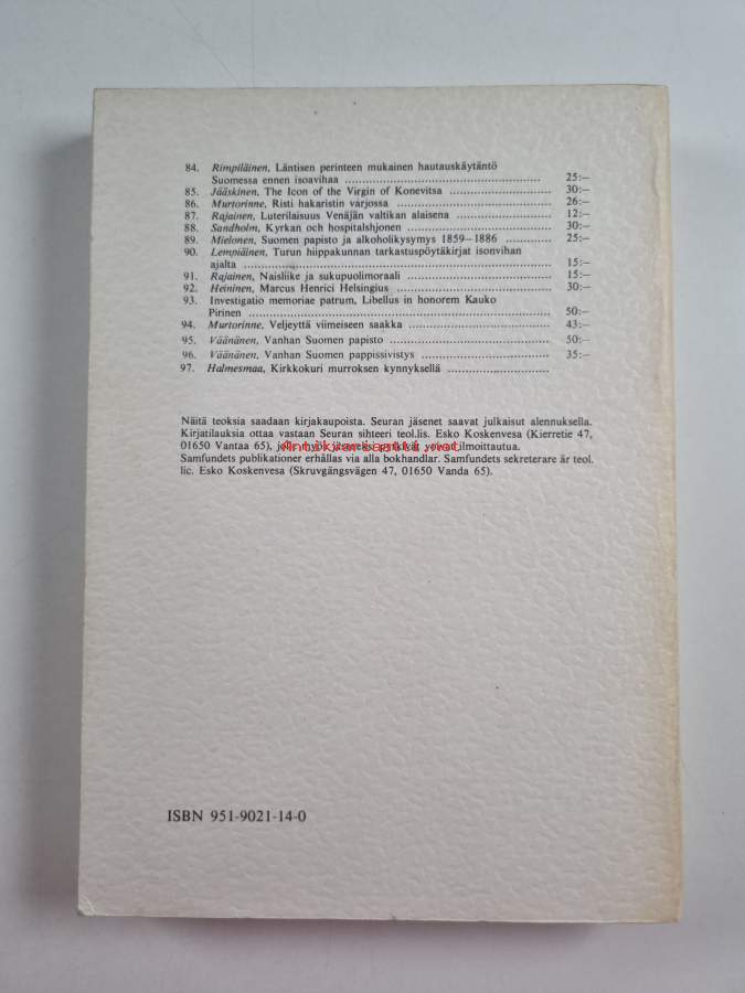 Koko nimi: Kirkkokuri murroksen kynnyksellä : kirkkokuria koskevan säännöstön kehittyminen Suomessa vuosina 1818-1847 sekä sen soveltaminen Turun tuomiorovastikunnassa (signeerattu, tekijän omiste)Sarja: Suomen kirkkohistoriallisen seuran toimituksia 97Asiasanat: kirkot, kirkkokuri