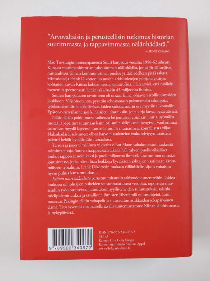 Muu(t) tekijä(t): Seppo HyrkäsAlkuteos: Mao's great famine : the history of China's most devastating catastrophe, 1958-62Asiasanat: historia, sosiaalihistoria, maatalous, poliittiset järjestelmät, kommunismi, joukkotuho, yhteiskuntaolot, talousjärjestelmät, teollistuminen, katastrofit, poliittinen väkivalta, totalitarismi, väestöhistoria, nälänhätä, socialhistoria, samhällsförhållanden, politiska system, befolkningshistoria, lantbruk, kollektivisointi, industrialisering, kommunism, politiskt våld, ekonomiska system, hungersnöd, totalitarism, katastrofer, massförstörelse, kollektivisering
